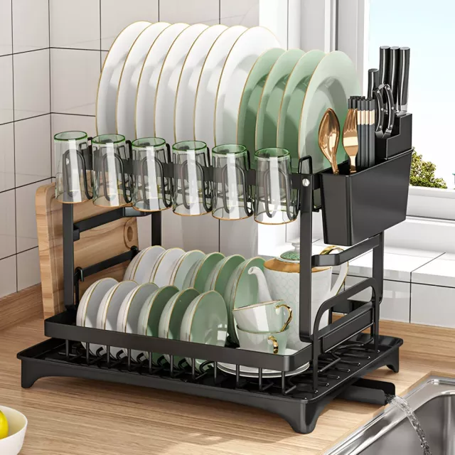 This dish rack is designed to do more in less space. The top tier holds up to 11 plates, coffee pots, or fresh fruits and veggies, while the bottom tier accommodates up to 18 bowls, bottles, small pots, or frying pans. A dedicated utensil holder and cup rack make sure every item has its place. Whether you’re cleaning up after family meals or prepping for a busy dinner party, this dish rack keeps everything organized and within reach.