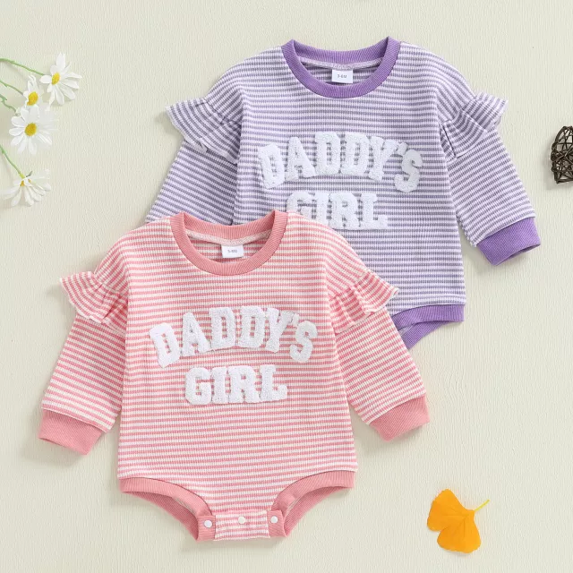 Wrap your baby girl in cozy autumn charm with this adorable striped ruffle jumpsuit. Designed with love and crafted from a soft cotton blend, this romper brings both comfort and cuteness to your baby’s wardrobe. The playful ruffled shoulders and delicate embroidered letters add a touch of sweetness, making it perfect for fall days spent indoors or out. This outfit isn’t just clothing — it’s a memory-maker for every giggle, cuddle, and photo moment.