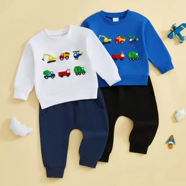 Get your little one ready for the crisp days of fall with this charming 2-piece boys outfit. This set includes a long sleeve embroidered sweatshirt adorned with fun vehicle motifs and a pair of matching elastic waist sweatpants for all-day comfort. Designed with active kids in mind, this outfit makes dressing up effortless while keeping your child snug, stylish, and ready for every autumn adventure.