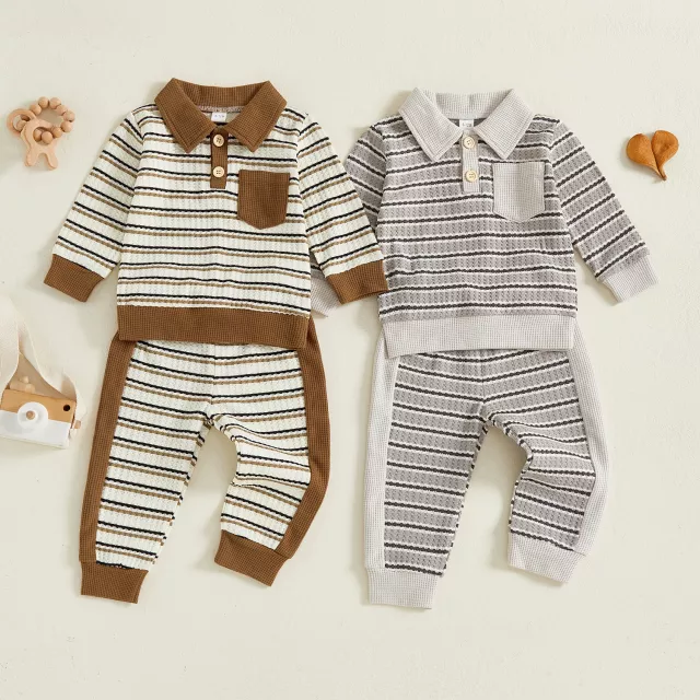 Dress your little one in comfort and charm this season with this cozy two-piece toddler boy outfit. Designed to keep him warm and looking stylish, this set includes a striped long-sleeve lapel button pullover paired with soft elastic waist pants. The casual yet polished design makes it perfect for everyday wear, family outings, or capturing those picture-perfect autumn moments.