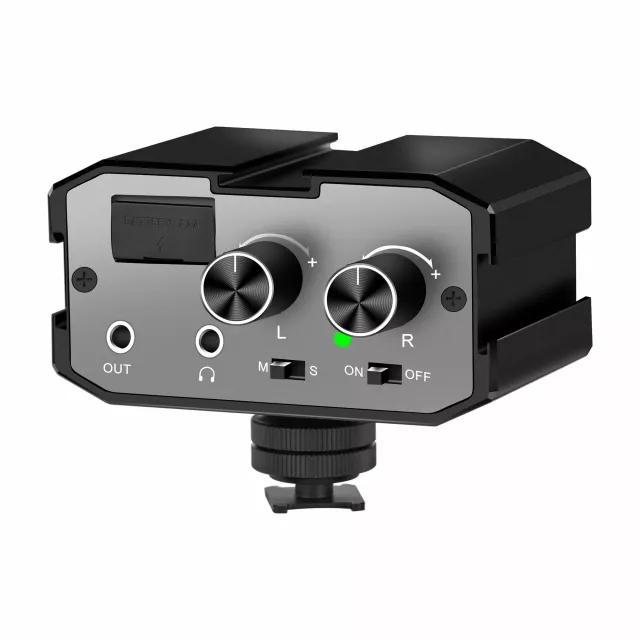 This audio adapter is loaded with features to help you achieve the perfect sound balance in any environment. Connect two 3.5mm microphones simultaneously and fine-tune each channel with precision using the dual gain-control knobs. The real-time monitoring port ensures you never miss unwanted background noise, while the mono/stereo output switch gives you full flexibility during post-production. An easy-to-see working status indicator keeps you informed, and the three built-in cold shoe mounts let you attach accessories with ease.