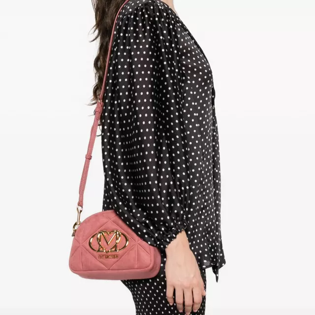 The Love Moschino brand is known for blending luxury with playful design, and this suede shoulder bag is no exception. Its pink hue adds a pop of color to cooler-weather outfits, while the high-quality suede ensures long-lasting beauty. The sleek silhouette makes it a timeless piece that won’t go out of style.