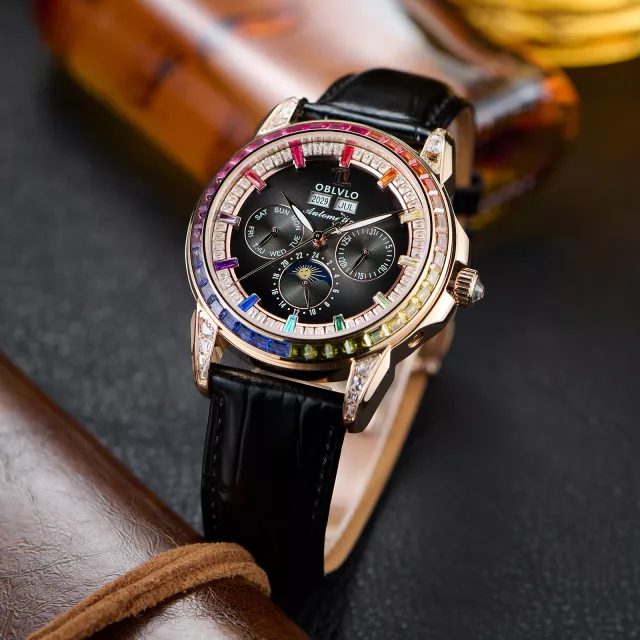 Men’s Moonphase Automatic Watch with Colorful Diamonds & Black Leather Strap
