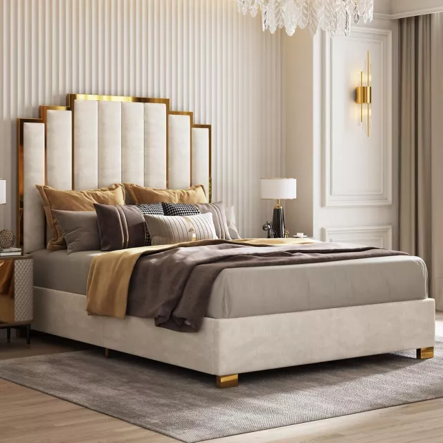 Modern Velvet Upholstered Platform Bed with Tall Gold Trim Headboard