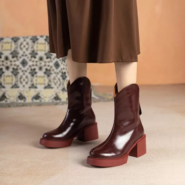 Crafted with genuine cow leather and lined with real wool, they offer superior warmth, breathability, and long-lasting quality. The round toe and square thick heel create a balanced silhouette that gives you just the right amount of lift while keeping things stable and walkable. With a sleek solid color design and easy-to-use zipper closure, these boots are as practical as they are stylish.